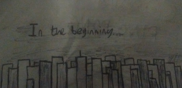 Description: A city scape is seen, showing the menacing towers, nightfall is soon to come, no doubt. The text "In the beginning..." is seen in the sky. The buildings are grey, unwelcoming, and unfriendly.
