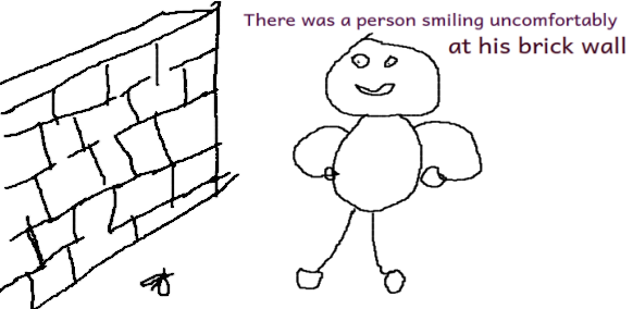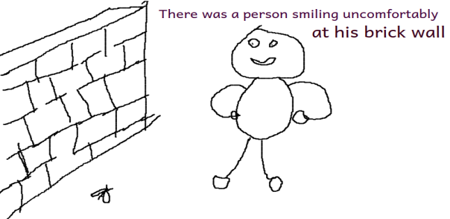Description: A man with no hair is seen looking at his brick wall. On the floor we see a fly. The text "There was a person smiling uncomfortably at his brick wall" is seen in the Andika font.