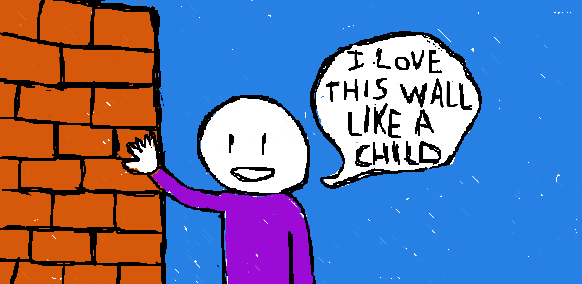Description: The man with no hair is touching his wall, he says "I love this wall like a child" with a smile on his face.