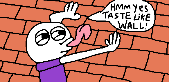 Description: He loves that wall so much, he even wants to eat it. He exclaims "Hmm yes, this taste like wall" while licking the wall with a worship face.