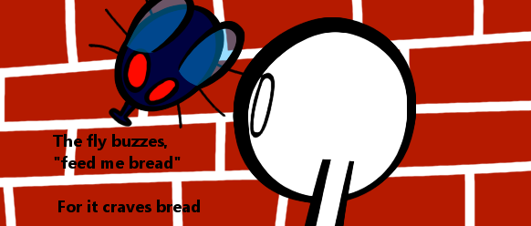 Description: The fly stares blankly at the man with it's two compound eyes. "Feed me bread," the fly buzzed, for he craved bread
