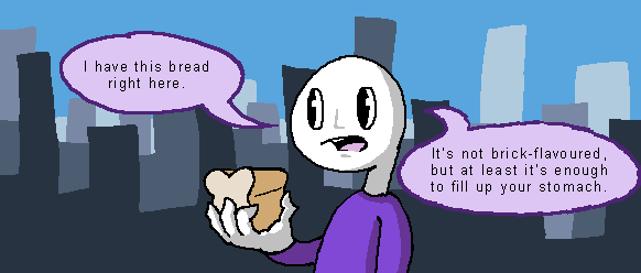 Description: A man hands over a loaf of bread. "I have this bread right here," he says. "It's not brick flavoured, but at least it's enough to fill up your stomach."
